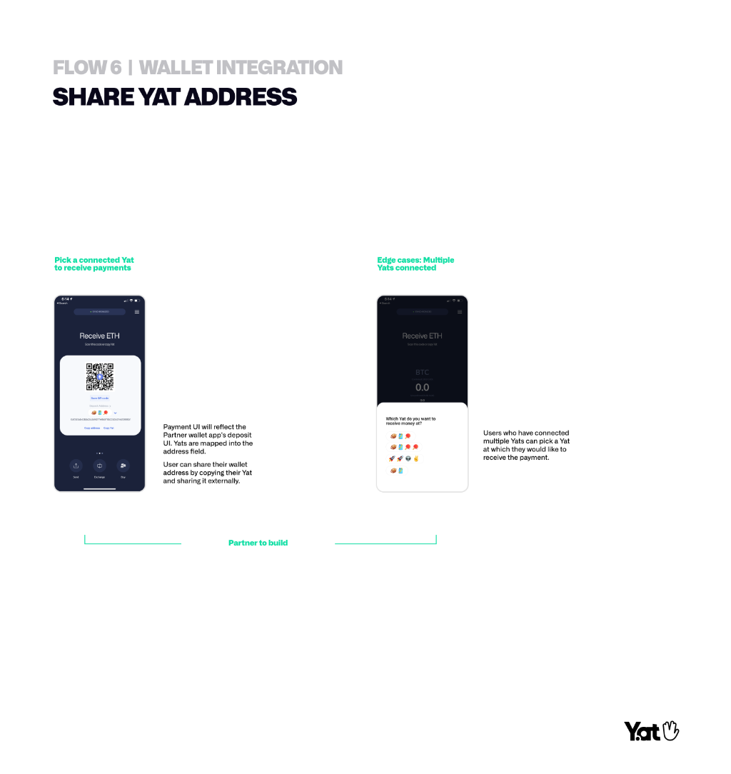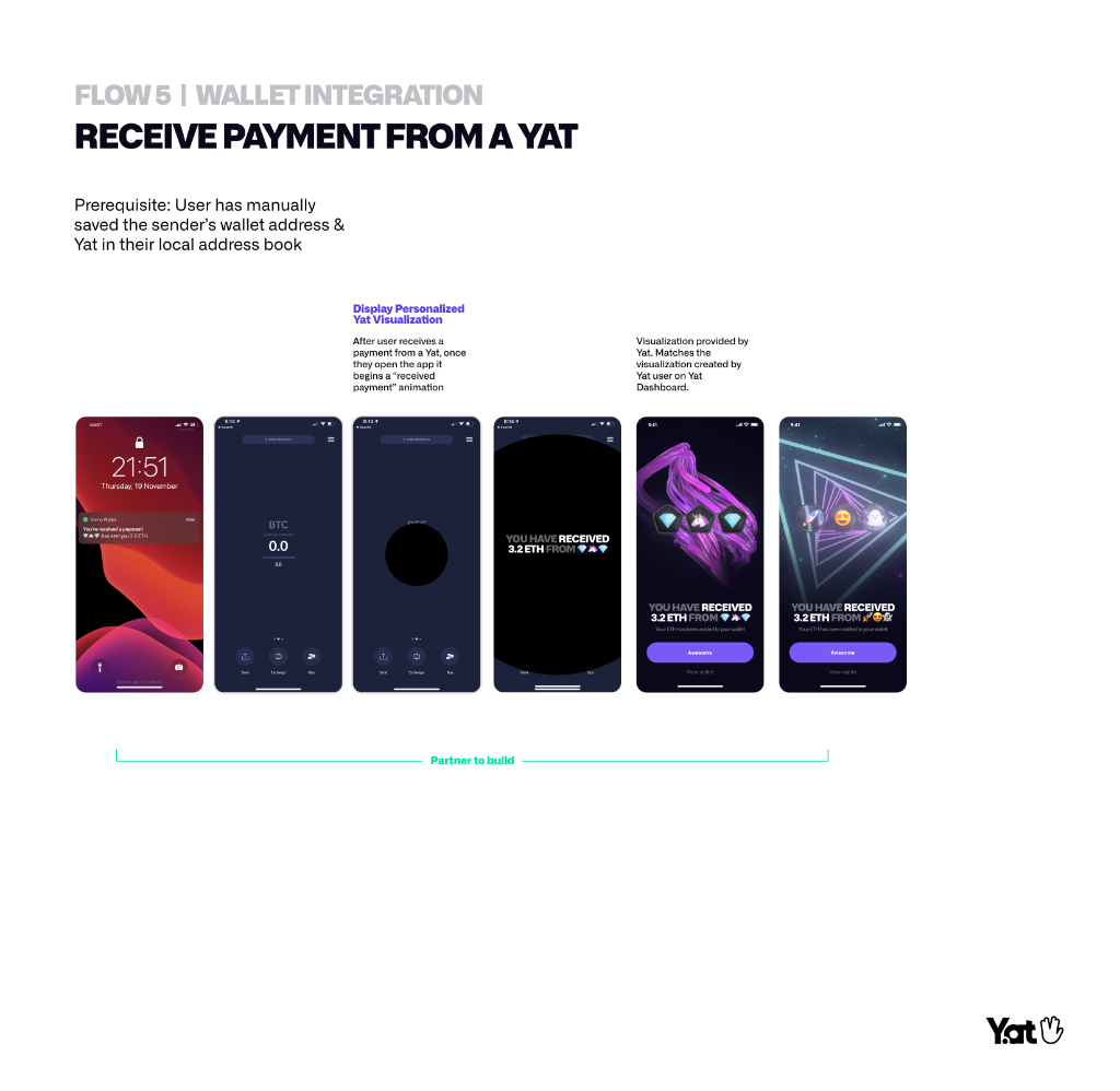 This guide describes the Yat integration process for the wallet partners. This guide contains a curation of flows recommended for wallet partners who want to integrate Yats to simplify the experience of sending and receiving payments.